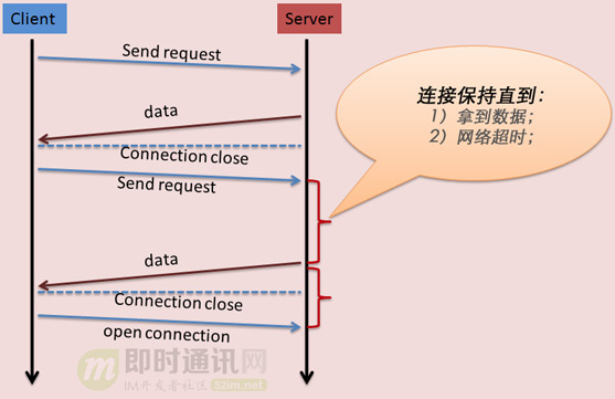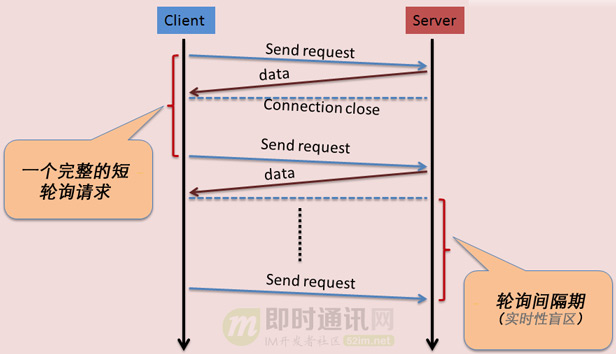 于是,一种被称为“短轮询”的数据获取模式出现了。在“短轮询”模式下,IM客户端定时轮询服务端,以便让用户知道是否有新的聊天消息存在。