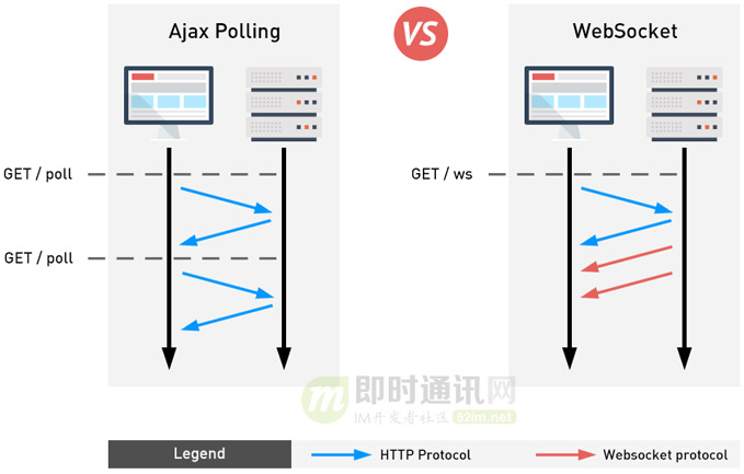 这种依赖于用户“主动”请求的数据获取模式,如果想实现IM系统,是无法即时获得最新的聊天消息的,因为用户并不知道新消息什么时候到来,而服务端也没有办法主动通知用户。